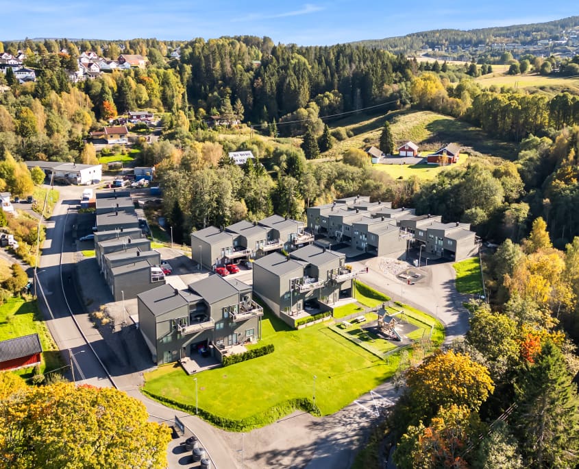 Langs den stille elven Varåa ligger 22 innholdsrike eneboliger i rekke, omgitt av grønne omgivelser og et rolig nabolag. Boligene er fordelt over tre plan og gir god plass til familier i alle livsfaser – med seks soverom, to stuer, tre bad og to vaskerom i hver bolig.
